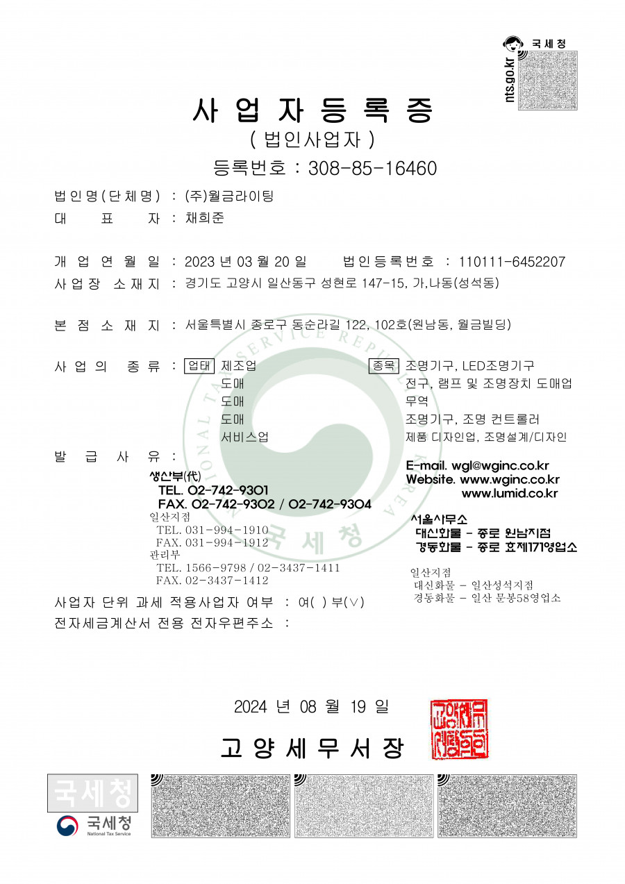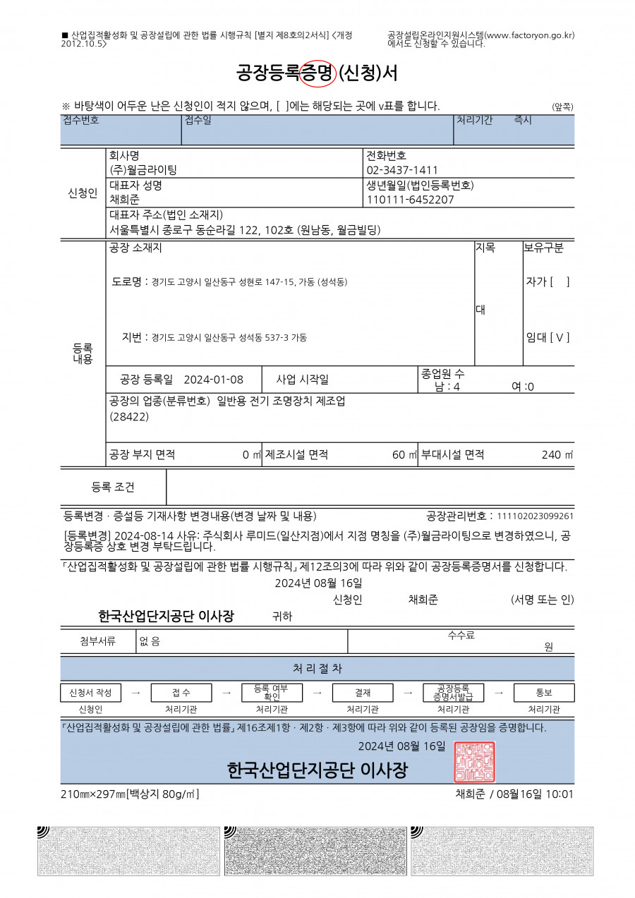 월금조명 사업자등록증, 공장등록증